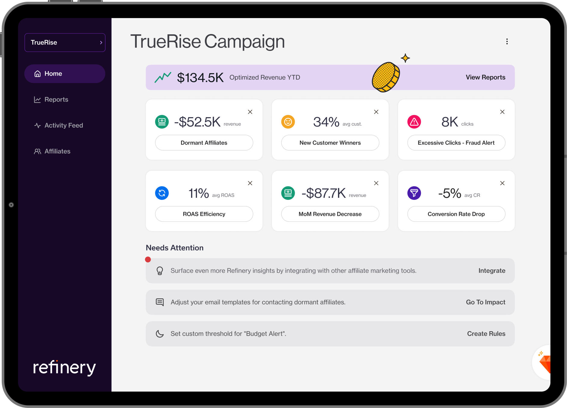 Skip the spreadsheets and scattered reports. Refinery automatically highlights obvious wins specific to your goals; giving you clear, actionable insights to make confident decisions—faster.